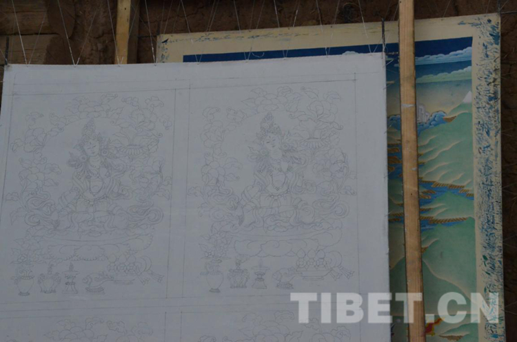 除了現(xiàn)場(chǎng)正在繪畫的3名學(xué)徒外,西熱秋久還有其他14名徒弟,他們大都是村里的建檔立卡戶。自2016年起,經(jīng)駐村工作隊(duì)和村“兩委”研討、建檔立卡戶同意后,最終扶持本村的致富帶頭人西熱秋久成立了唐卡繪制農(nóng)牧民專業(yè)合作社,定為村里的扶貧產(chǎn)業(yè),建檔立卡戶可以來(lái)此學(xué)習(xí),成為學(xué)徒后在這里學(xué)習(xí)唐卡繪制,吃住都在這里并能獲得一定的工資。
