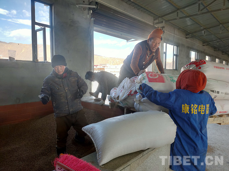 在該園的格薩甲波糧倉現(xiàn)場,裝滿糧食的拖拉機和貨車,有的忙著把青稞卸下來,有的忙著把青稞倒進糧食精選機里、有的忙著稱重、有的忙著做登記,忙得不可開交。