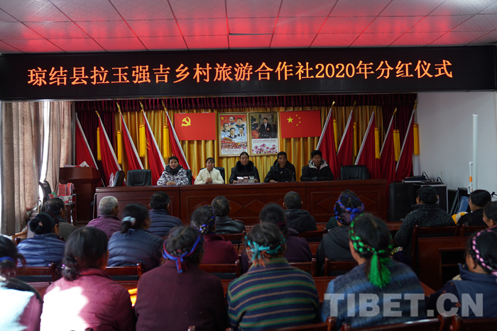 這是拉玉強(qiáng)吉鄉(xiāng)村旅游專(zhuān)業(yè)合作社首次分紅儀式的現(xiàn)場(chǎng),44戶(hù)村民代表臉上掛滿了笑容,準(zhǔn)備分享勤勞付出結(jié)出的香甜碩果。