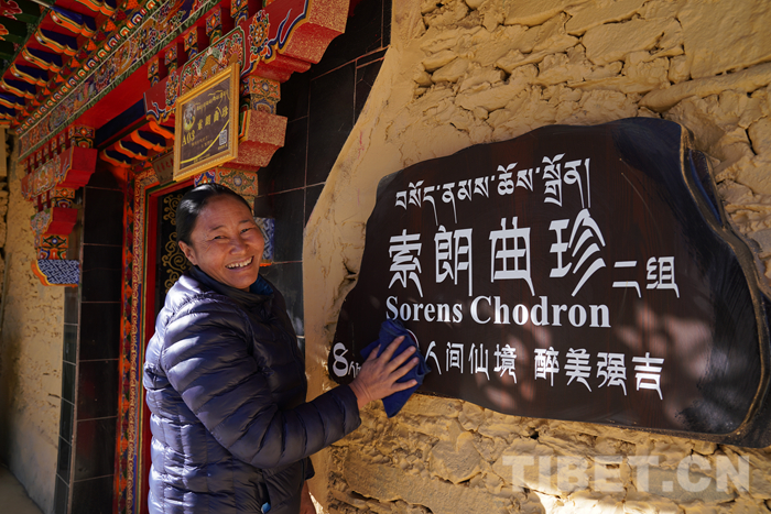 圖為索朗曲珍正在擦亮自家民宿門(mén)牌