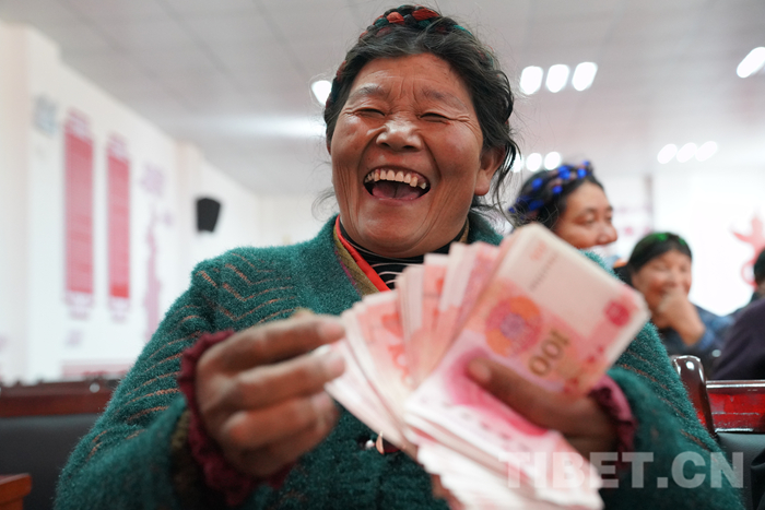 令人激動(dòng)的時(shí)刻來(lái)臨了。“二組索朗曲珍,分紅26739元;二組支張,分紅6495元;一組朗杰曲珍,分紅2668元……”社員們?nèi)讲⒆鲀刹剑瑵M臉喜滋滋地依次上臺(tái)接過(guò)沉甸甸的分紅。他們?cè)诜旨t發(fā)放清單上填上名字,摁上手印后,喜笑顏開(kāi)地?cái)?shù)著手里的錢(qián)。