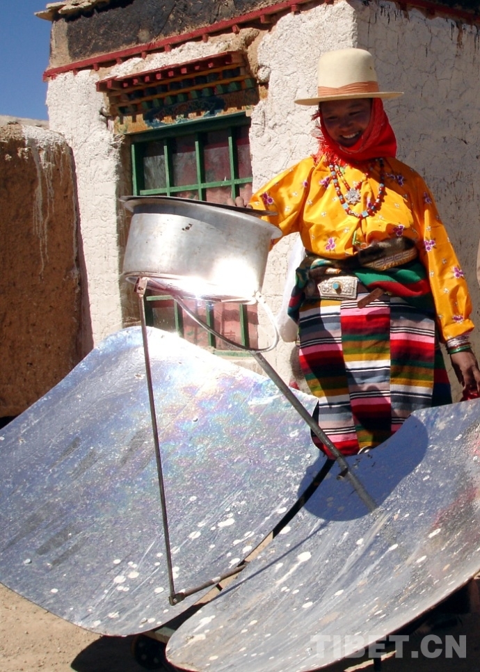 在藏北高原,現(xiàn)在隨處可見城鎮(zhèn)里的一個個太陽能路燈、一棟棟太陽能采暖樓和采暖房,一排排房頂上斜立著的太陽能熱水器,就連牧民家也常常可以看到安放在窗前、屋頂和院內的電池板、太陽灶。利用太陽能燒水做飯和發(fā)電照明,既方便又干凈,老天爺還不收燃料費。
