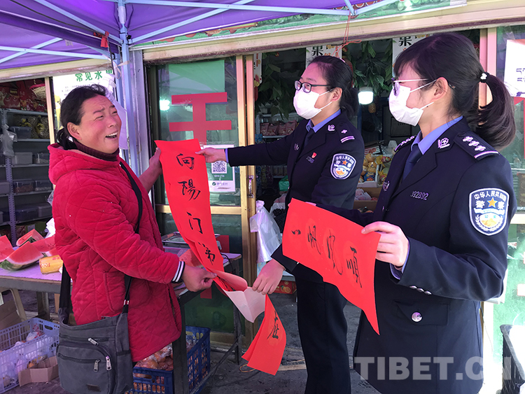2月7日,拉薩邊檢站邀請(qǐng)拉薩市文聯(lián)書(shū)法家協(xié)會(huì)共同開(kāi)展“同心同書(shū)——祖國(guó)新春好”送萬(wàn)福進(jìn)萬(wàn)家活動(dòng)。4名書(shū)法家揮毫潑墨,書(shū)寫(xiě)漢文藏文春聯(lián),散發(fā)著墨香的春聯(lián)凝聚著無(wú)限的祝福。隨后,邊檢站格?;ㄅ訄?zhí)勤隊(duì)民警為駐地商戶(hù)送“福”送春聯(lián)。在駐地的一家超市,商戶(hù)張大姐興高采烈地與民警一邊貼春聯(lián),一邊笑著說(shuō):“感謝你們送來(lái)的新春祝福。今年雖然沒(méi)能回家過(guò)年,但有你們的陪伴照顧,我們感到很開(kāi)心?!?/p>