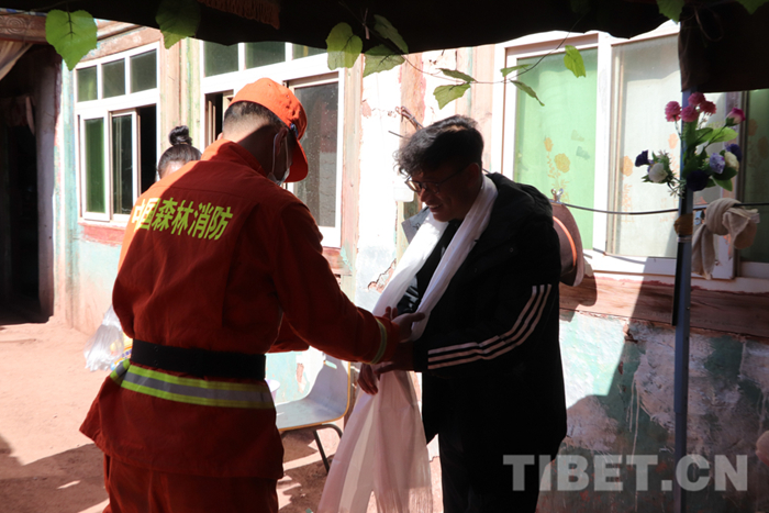 圖為卡若區(qū)森林消防中隊指戰(zhàn)員為群眾獻(xiàn)上哈達(dá)