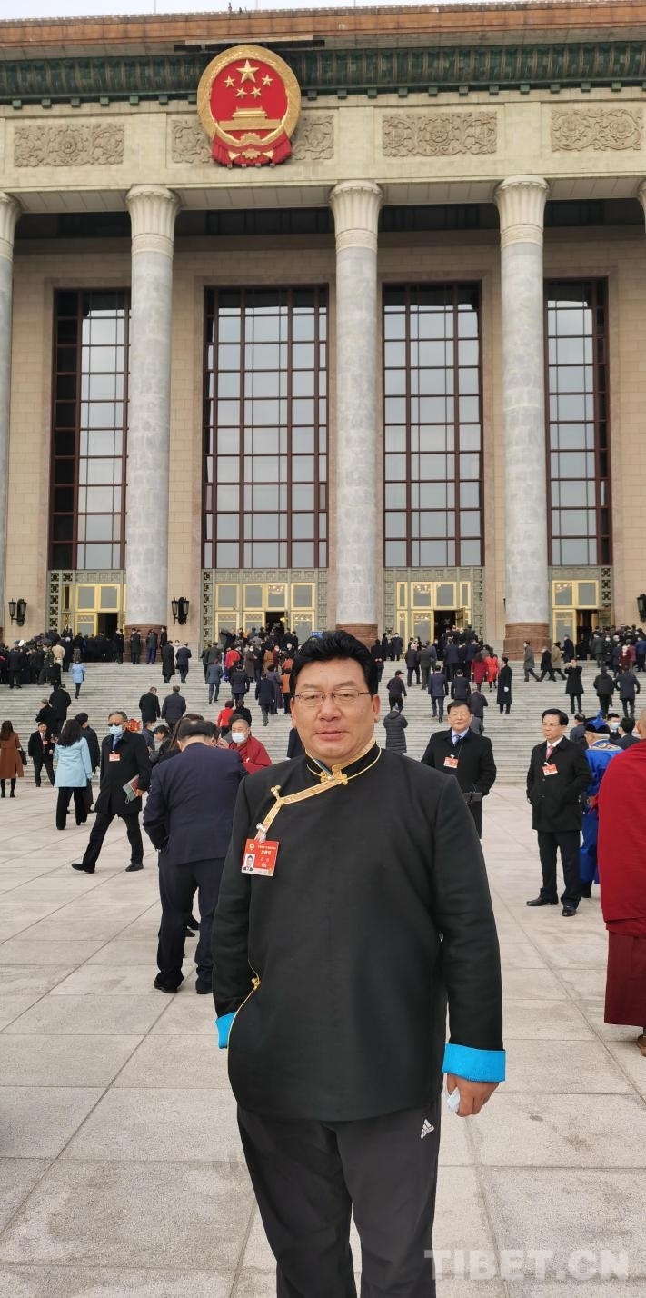 圖為全國(guó)政協(xié)委員扎西在人民大會(huì)堂前