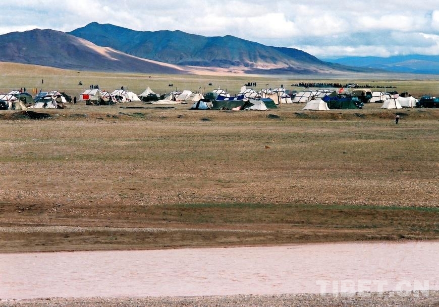 圖為在文部辦事處(現(xiàn)改為尼瑪縣)的布藏河畔舉行賽馬會前,城鎮(zhèn)人家正在搭建各自的帳篷(唐召明1987年攝)