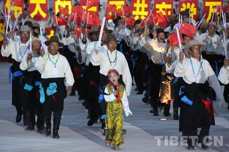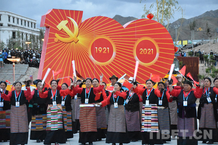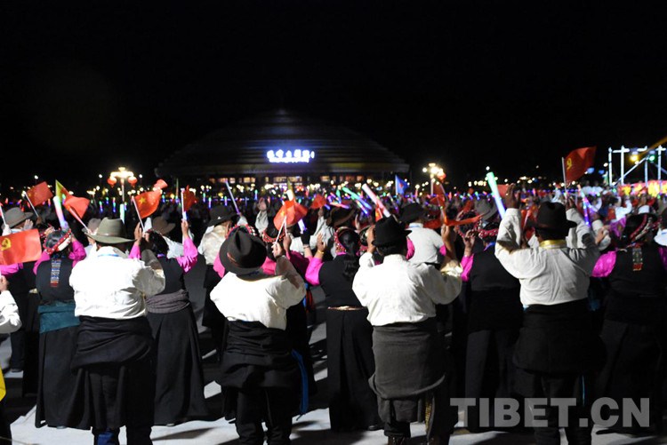 珠峰文創(chuàng)園區(qū)的聯(lián)歡活動分為三個章節(jié),以《在燦爛的陽光下》《各族人民感恩黨》《西藏人民齊歡唱》三首歌曲作為開篇樂,來自日喀則各族各界的演員們,身著日喀則特色節(jié)日盛裝,在廣場中央,擺出數(shù)字“100”的造型,跳起歡快的鍋莊舞,在燈光的輝映下,造型美輪美奐。
