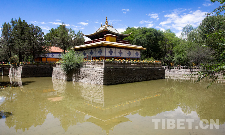 這座隱匿于茂密園林中的宮殿,上下兩層設(shè)計精巧別致,漢白玉石欄,核桃木地板,南北通透的玻璃窗和滿墻滿壁的點染,勾畫著的高原勝跡。壁畫環(huán)繞四壁,極為養(yǎng)心養(yǎng)眼。