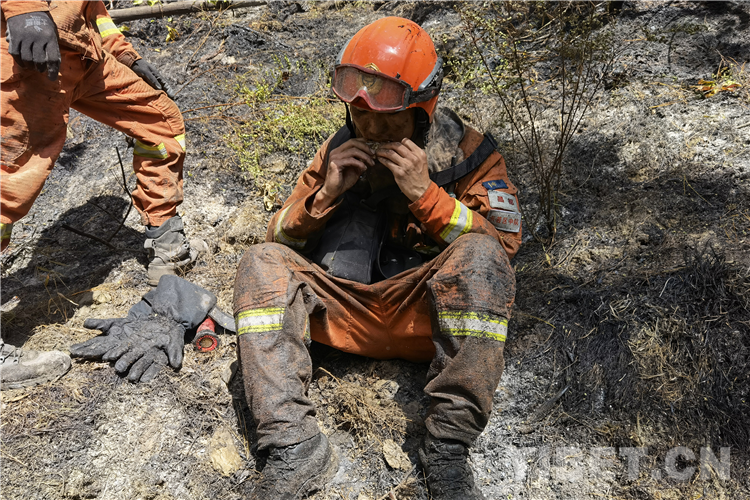 連日來(lái),在火場(chǎng)上,席地而睡的消防員和寧吃干糧不拿群眾“一針一線(xiàn)”的消防員隨處可見(jiàn)。(中國(guó)西藏網(wǎng) 通訊員/張強(qiáng) 夏明勇)
