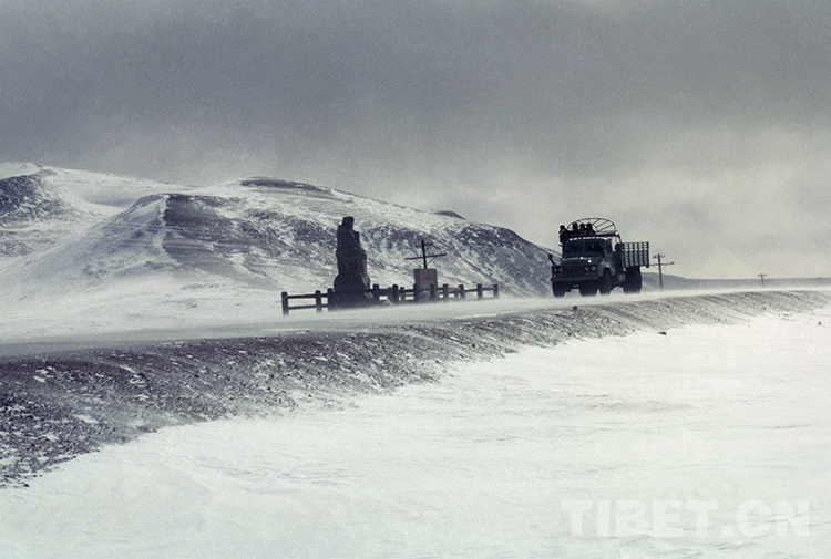 這是一輛汽車正在通過(guò)青藏公路海拔5231米的唐古拉山口(唐召明1991年攝)