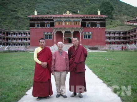 2004年9月3日,陳慶英先生在西藏自治區(qū)昌都市江達(dá)縣瓦拉寺調(diào)研,拍攝下大經(jīng)堂外廊21幅《格薩爾》壁畫。其后將他在寺內(nèi)外所拍全部珍貴照片贈送作者,希望作者好好研究。圖為陳老師與瓦拉寺僧人合影。