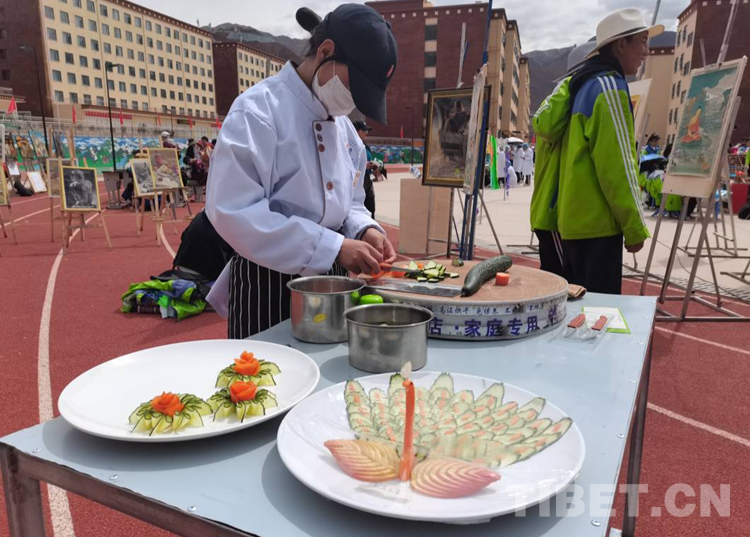圖為來(lái)自察雅縣的加永卓瑪同學(xué)展示自己冷拼作品“孔雀開屏”