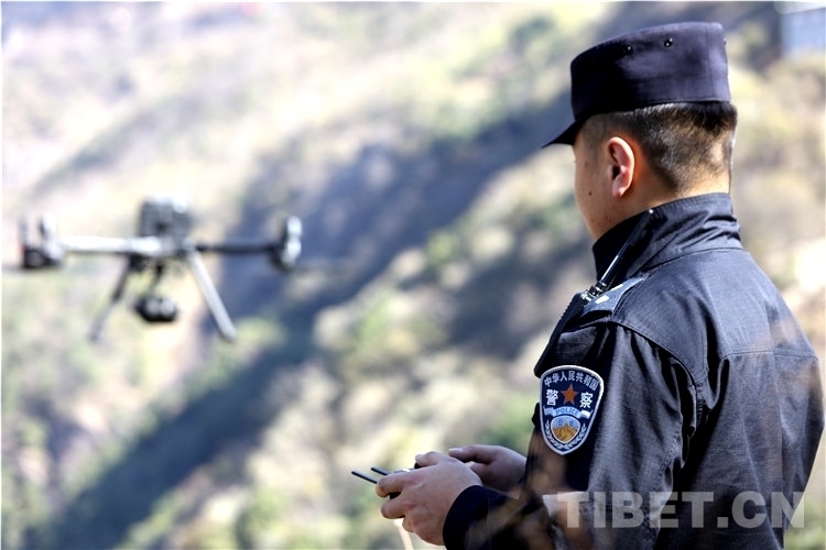 圖為民警利用無人機(jī)對(duì)波曲河道兩翼滑坡地段進(jìn)行勘測(cè) 攝影:鄒興國(guó)