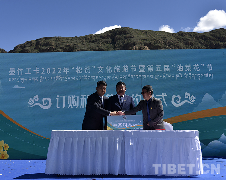 在油菜花田中舉辦的開幕式上,墨竹工卡縣農牧業(yè)凈土產業(yè)發(fā)展有限公司代表與唐加鄉(xiāng)、扎西崗鄉(xiāng)分別簽訂認購、預售合同。在豐收時節(jié),該公司將以高出市場的價格訂單式收購當地農戶種植的油菜,預計收購4000噸油菜籽。