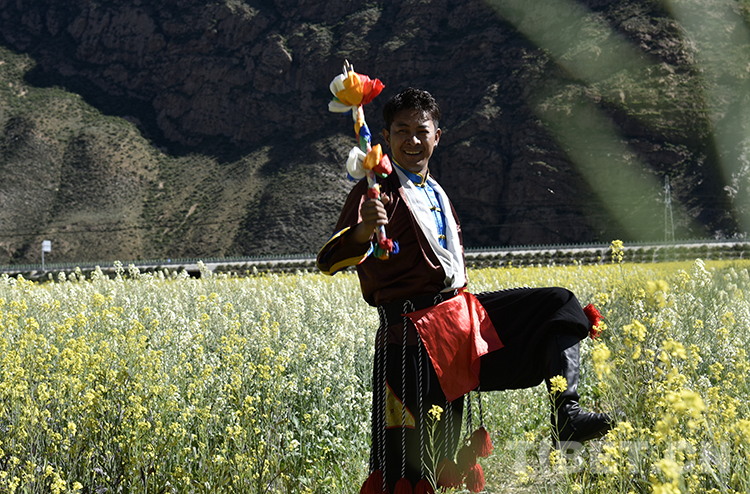 圖為墨竹工卡縣松贊文化旅游節(jié)暨第五屆油菜花節(jié)開幕式前,舞蹈演員在油菜花田中留影 攝影:王媛媛