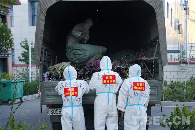 圖為那曲森林消防大隊(duì)組織搬運(yùn)保障帳篷