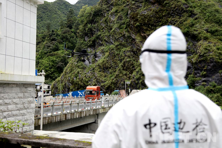 圖為民警正在使用無人機(jī)對貨運通關(guān)現(xiàn)場進(jìn)行實時監(jiān)測 攝影:尼瑪?shù)┰?/p>