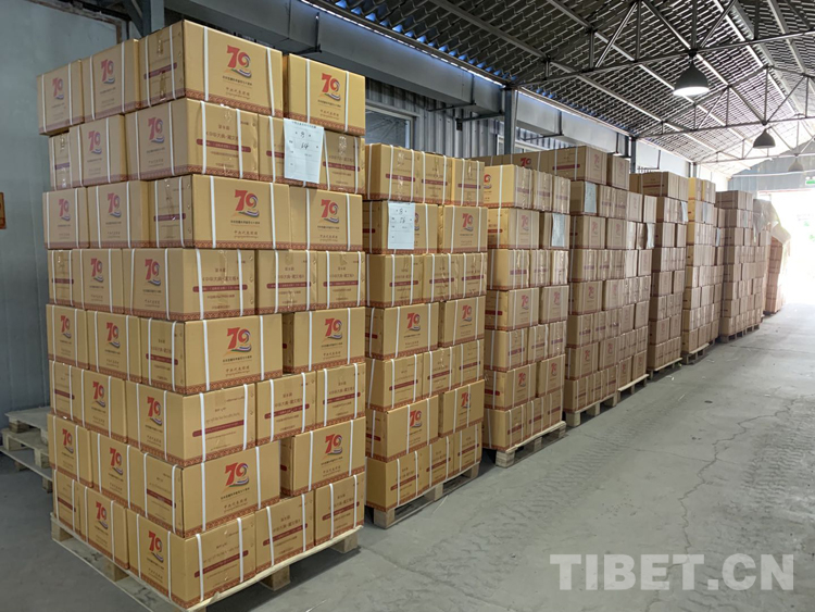 圖為2021年,出席西藏和平解放70周年慶?;顒?dòng)的中央代表團(tuán)作為禮品之一贈(zèng)送西藏各寺廟的《中華大典?藏文卷》第一批14種文集201卷經(jīng)精心包裝即將運(yùn)往西藏