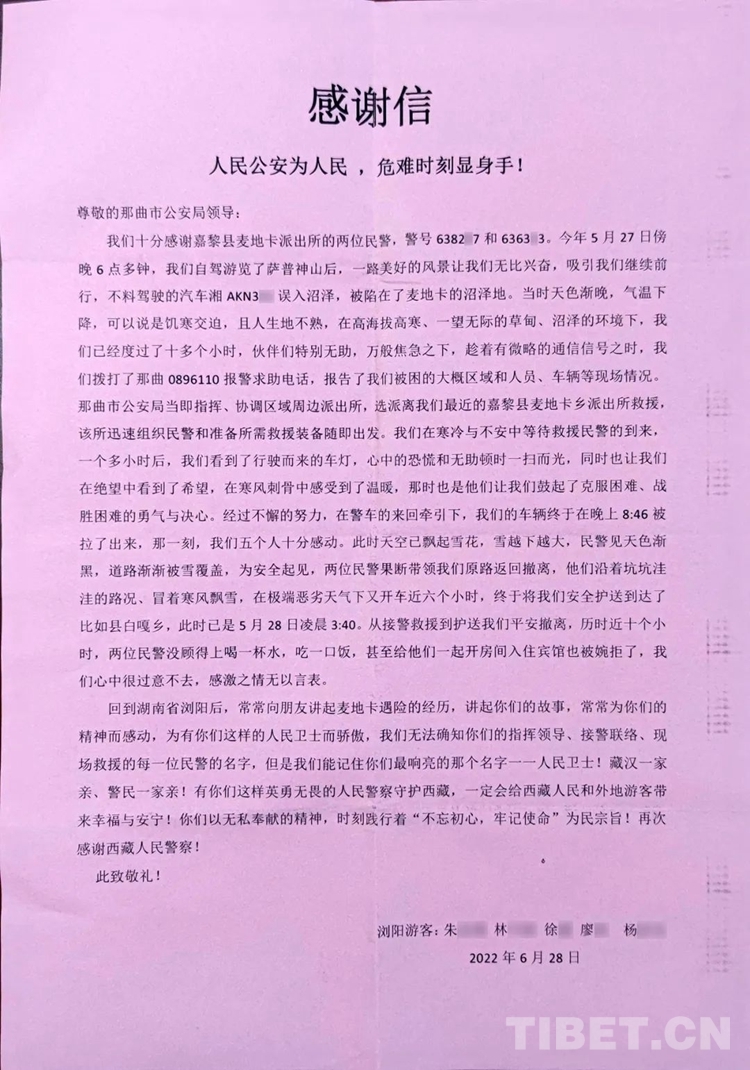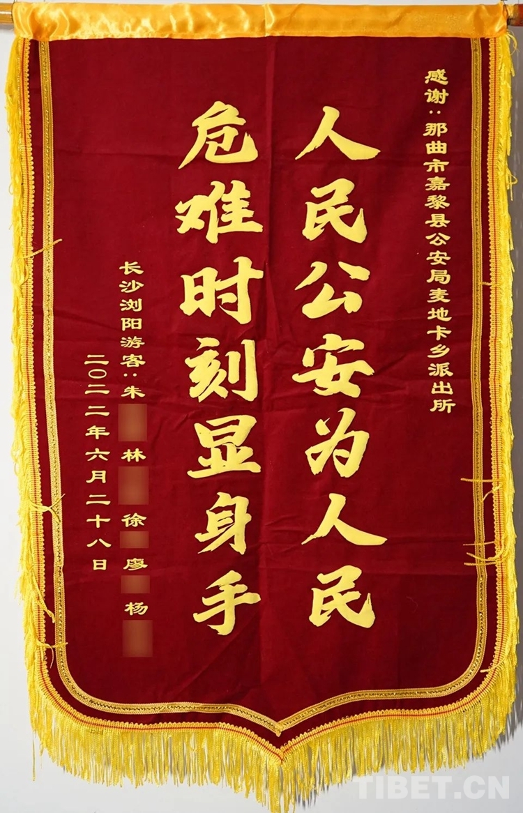 近日,那曲市公安局收到了一份特別的禮物,這是一面印著“人民公安為人民、危難時(shí)刻顯身手”的錦旗和一封飽含深情的感謝信。這份特別的禮物是湖南市民朱先生、徐先生寄到西藏的,以此表達(dá)對那曲市公安局、那曲市嘉黎縣公安局麥地卡鄉(xiāng)派出所民警的感激之情。