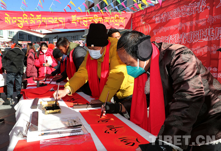 圖為活動(dòng)現(xiàn)場(chǎng)書(shū)法家在書(shū)寫(xiě)藏文春聯(lián)