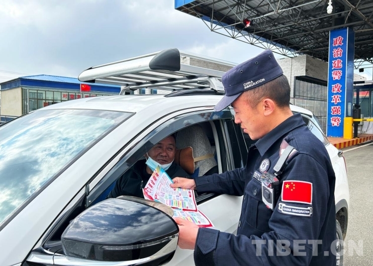 圖為錯(cuò)那邊境檢查站執(zhí)勤民警為過往旅客發(fā)放宣傳單