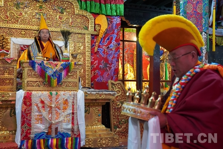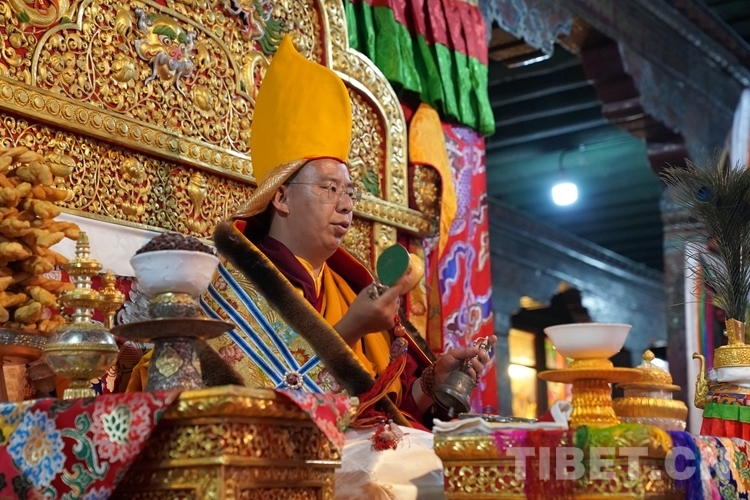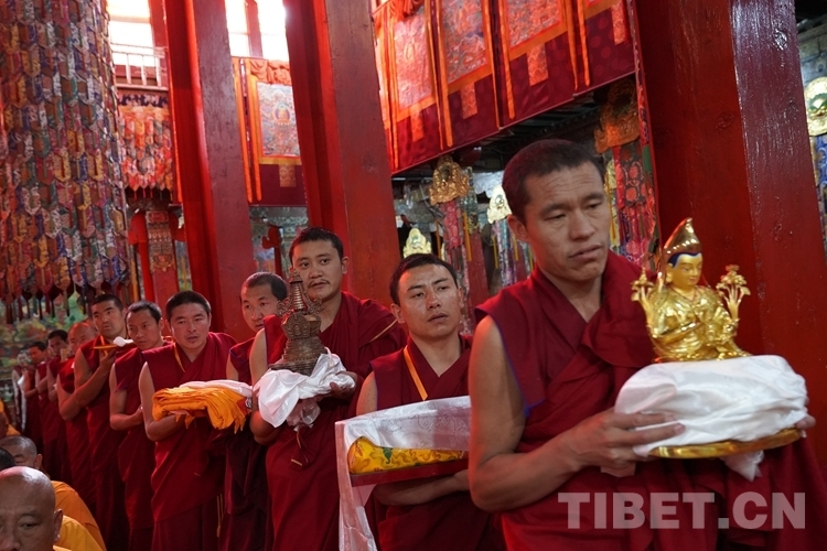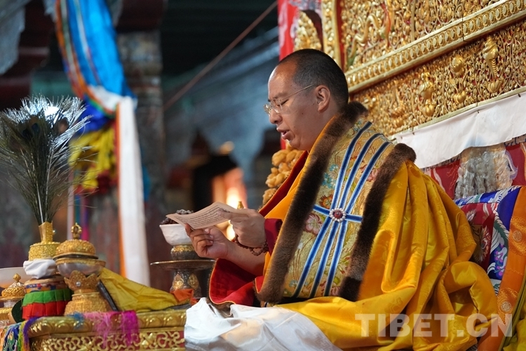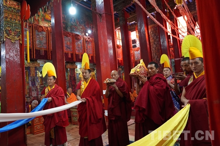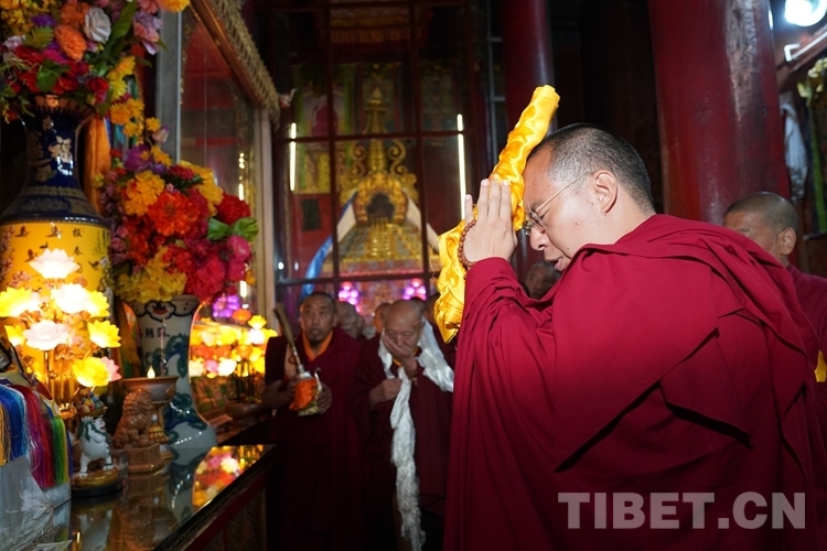 在措欽大殿內(nèi),班禪每到一座佛像前都雙手合十為眾生祈禱,并向佛像敬獻(xiàn)哈達(dá),祈求國(guó)泰民安、利樂眾生。措欽大殿內(nèi)的眾僧也并排而坐齊聲誦經(jīng)、虔誠(chéng)祝禱。禮佛后,班禪登上措欽大殿寶座,寺廟高僧代表向班禪敬獻(xiàn)曼扎(佛像、經(jīng)書、佛塔)、誦祈愿永駐贊;班禪向寺廟僧眾傳授賜予《文殊真實(shí)名經(jīng)》,并為僧眾摸頂。