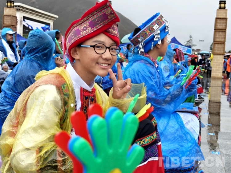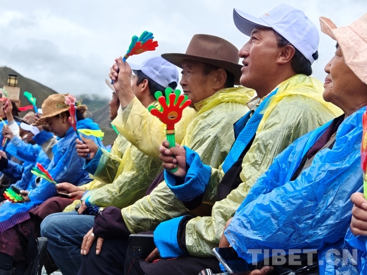 當(dāng)天上午,雨水時(shí)急時(shí)緩下著。當(dāng)?shù)孛癖姄沃鴤?、披著雨衣早早落座等待演出開始。白瑪次仁是附近的村民,他告訴記者:“我平時(shí)就喜歡唱歌和跳舞,所以收到有文藝演出的通知就早早過來觀看,畢竟平時(shí)很少看到如此大型的演出?!?/span>