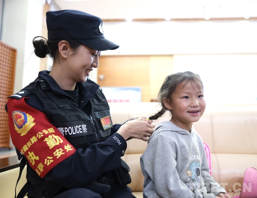 圖為5月31日,馬曉琴在執(zhí)勤時(shí),深受小朋友的喜愛,拉著格?;ㄞp起頭發(fā),想要跟格桑花一樣靚麗 攝影:賀瑞明