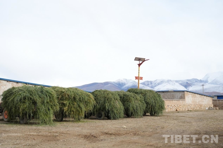 圖為雪山下的養(yǎng)羊合作社內,已經裝好車的燕麥草 攝影:邊子捷