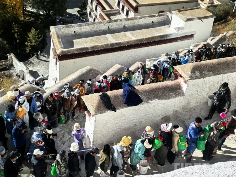 圖為群眾在布達拉宮刷墻現(xiàn)場排起長隊 攝影:王淑