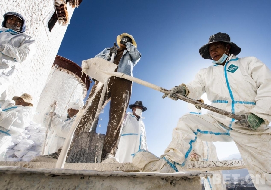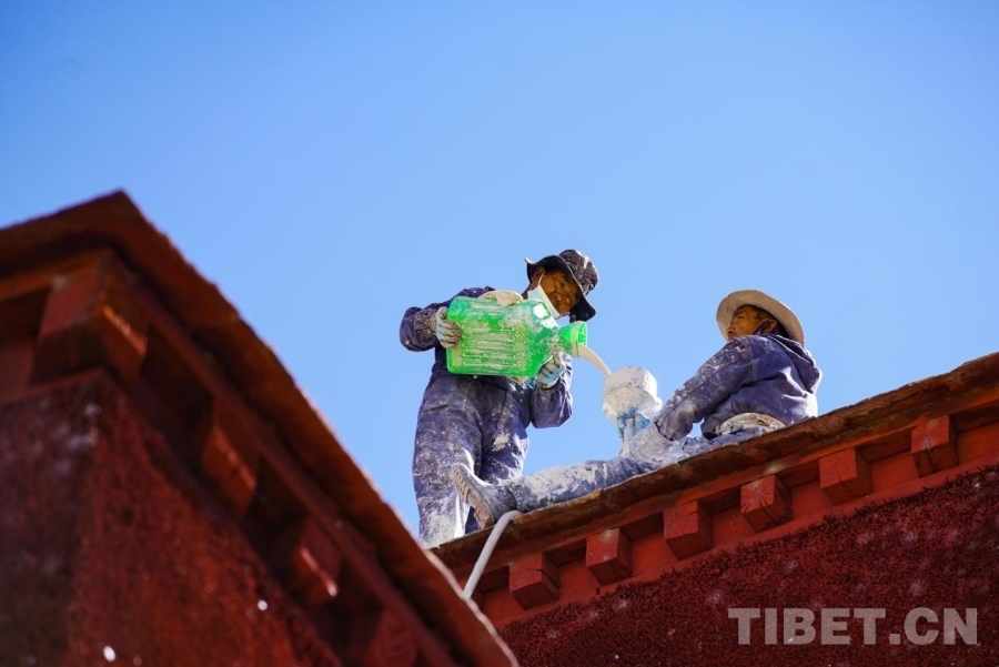 布達拉宮外墻粉刷一般持續(xù)7-10天,要在藏歷的9月22日之前全部完成。此刻,拉薩的雨季剛剛結(jié)束,冬季的寒冷結(jié)冰尚未到來,每年大家都趕在入冬之前完成這一浩大的粉刷工程。