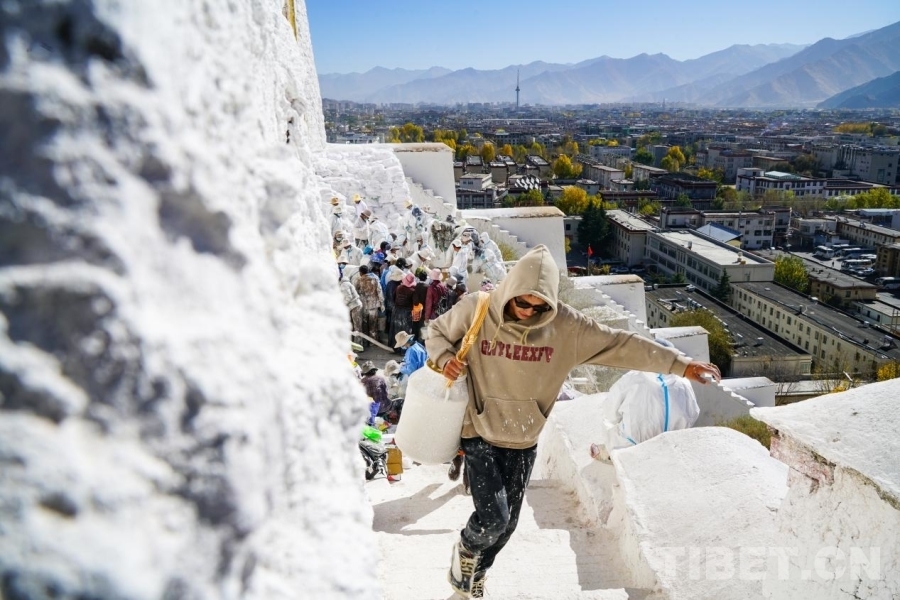 中國西藏網(wǎng)訊 巍峨的布達拉宮,是日光之城拉薩的象征,悠久的歷史,古老的文化,博得世人的矚目和贊賞。每到金秋時分,布達拉宮也即將進入一年中最“絢彩”的時刻,大量當?shù)厝罕姾陀慰突碇驹刚?,共同為粉刷布達拉宮的外墻而做準備,以便更好地保護這一古老的世界文化遺產(chǎn)建筑。