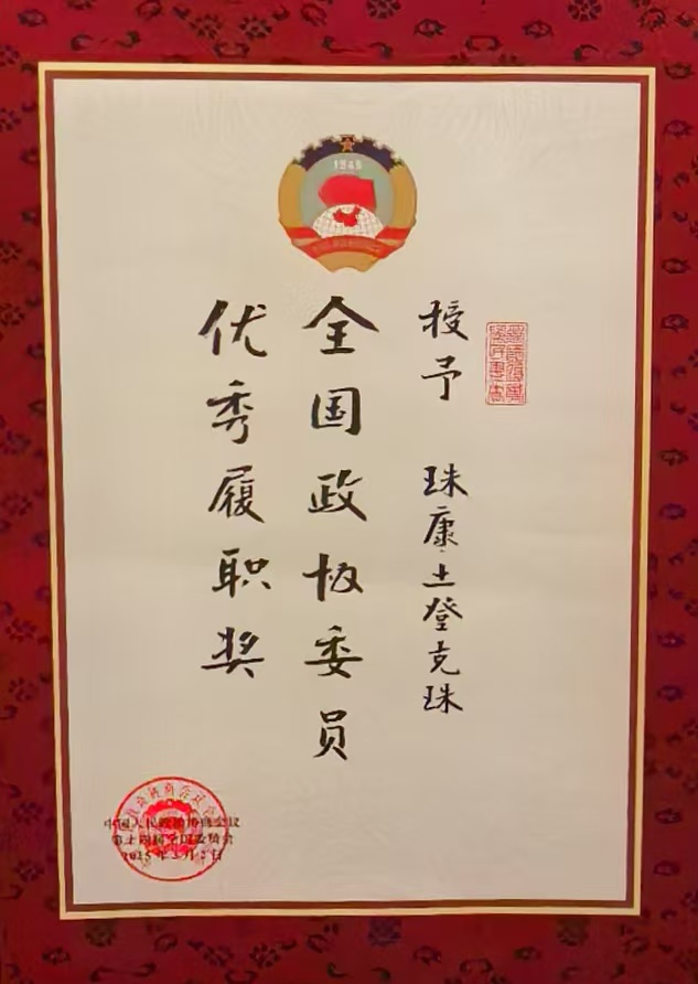 圖為珠康·土登克珠榮獲的2024年度“全國政協(xié)委員優(yōu)秀履職獎(jiǎng)”