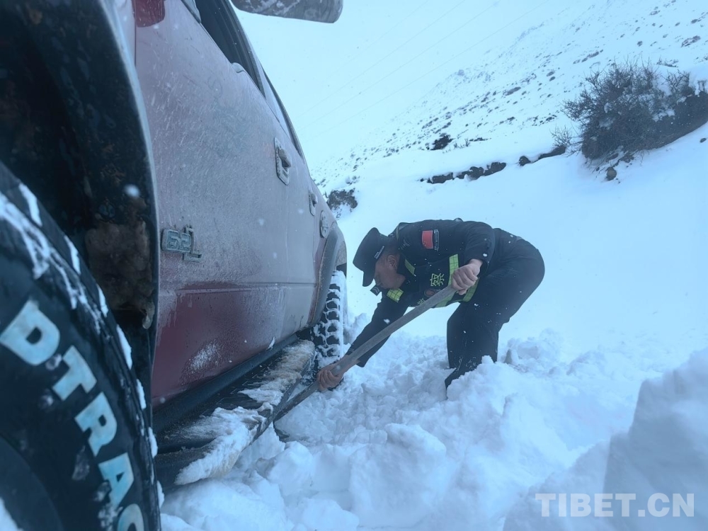 圖為竹瓦根邊境派出所民警為被困車輛除雪