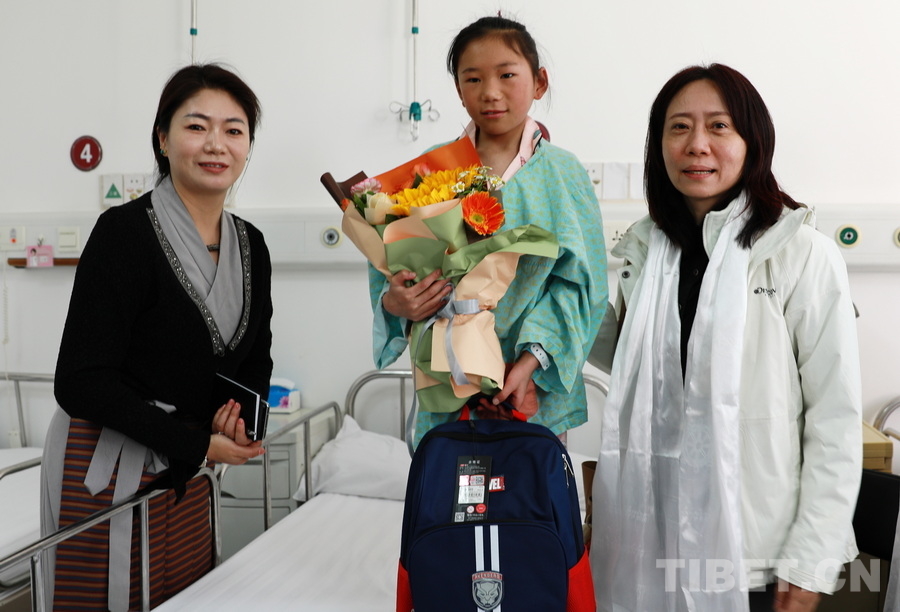 圖為北京啟明星辰慈善公益基金會理事長王?,摚ㄓ乙唬┡c四川省甘孜州石渠縣衛(wèi)健局副局長向巴啟西(左一)向在北京朝陽醫(yī)院接受救治的四川省甘孜州石渠縣脊柱側(cè)彎患兒贈送鮮花與學習用品 攝影:劉莉