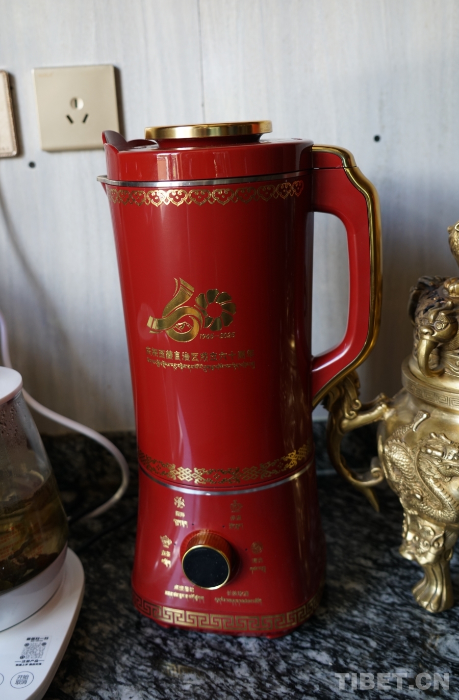 走進(jìn)客廳,茶幾上擺放著一臺紅色嶄新的全自動酥油茶壺,機身上鐫刻著“慶祝西藏自治區(qū)成立60周年”的字樣。另一旁的展柜上,一套鎏金茶碗嶄新如初,仿佛能映出人影——那是2015年中央代表團贈送的西藏自治區(qū)成立50周年禮物。這些細(xì)節(jié),無不透露出主人對它的珍視。