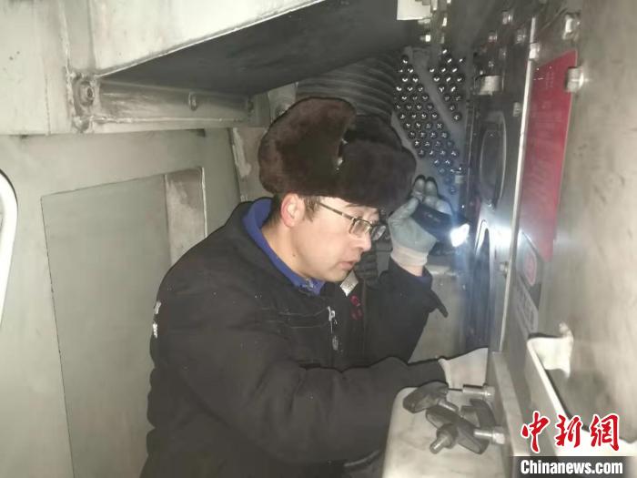 圖為封小軍檢查機(jī)車(chē)走行部。陳勇 攝