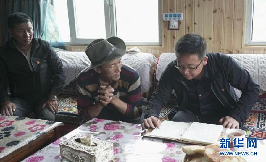 青海省玉樹(shù)藏族自治州囊謙縣覺(jué)拉鄉(xiāng)尕少村第一書(shū)記麻成學(xué)(右)在農(nóng)牧民家中走訪(2019年8月30日攝)。新華社記者 李亞光 攝