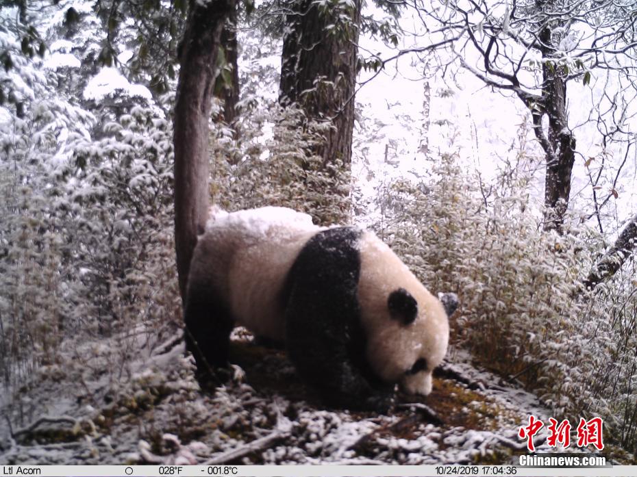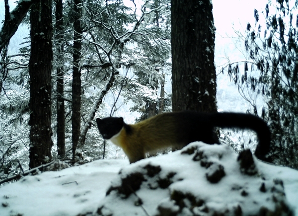 此次拍攝到的視頻資料顯示,在保護區(qū)多個點位都有大熊貓活動的身影,并且出現了多次,其中在同一區(qū)域,兩次拍到大熊貓嗅味樹標記行為;在同一點位同時拍攝到大熊貓、川金絲猴、金貓、黃喉貂、黑熊、毛冠鹿、野豬、豪豬等8種動物活動影像。此外,保護區(qū)還首次拍攝到金貓活動影像。