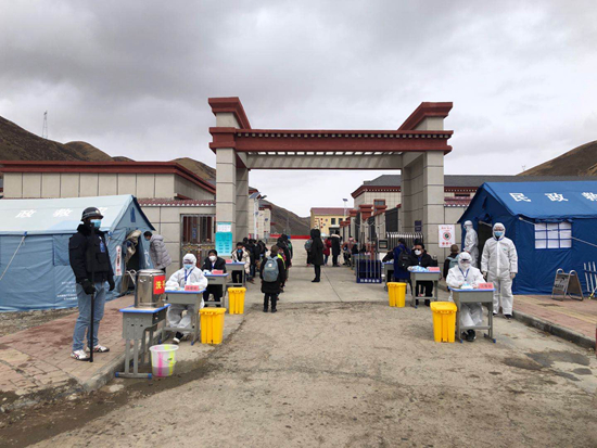 學(xué)校的防疫工作開(kāi)始了,食堂前架起了一個(gè)大水桶,給孩子們洗手用。老師們換上了從頭裹到腳的防護(hù)服,站在校門(mén)口。