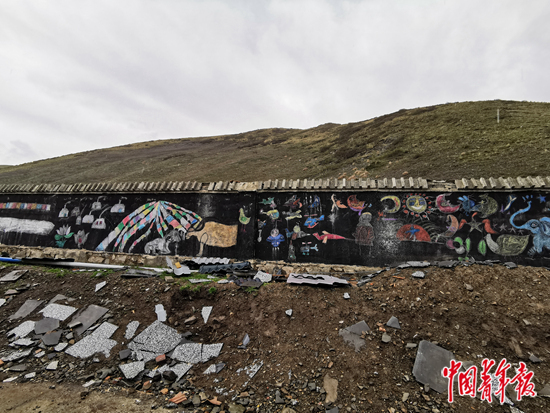 學(xué)校里有一面墻,現(xiàn)代文明的痕跡與傳統(tǒng)游牧的習(xí)俗,被學(xué)生們畫(huà)在了一起。畫(huà)上有五彩經(jīng)幡、雪山羊群,有絢麗的格桑花和溫暖的氈房,以及穿著藏袍大笑的孩子。畫(huà)上還有直升飛機(jī)、火箭和飛碟。