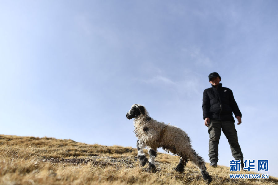 在青海省剛察縣泉吉鄉(xiāng)寧夏村,達日杰懷抱一只小羊羔(11月12日攝)。 新華社記者 張宏祥 攝