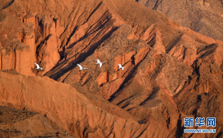 1月22日,大天鵝在青海省貴德縣境內(nèi)飛翔。新華社記者 張宏祥 攝