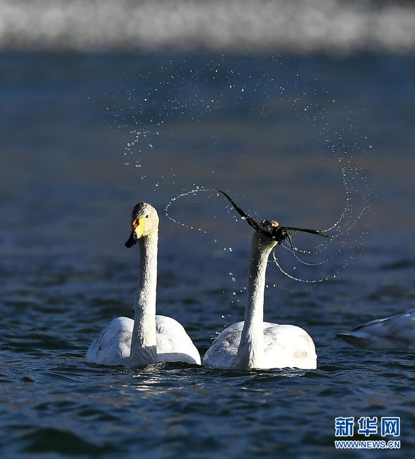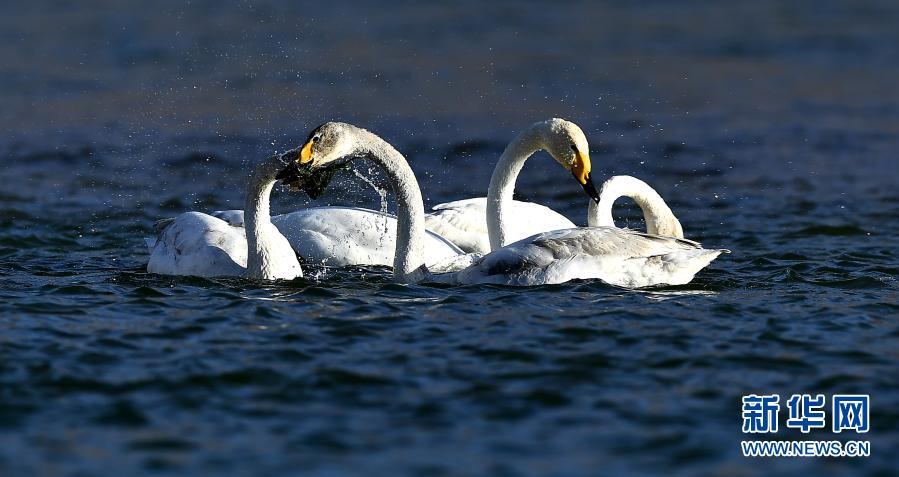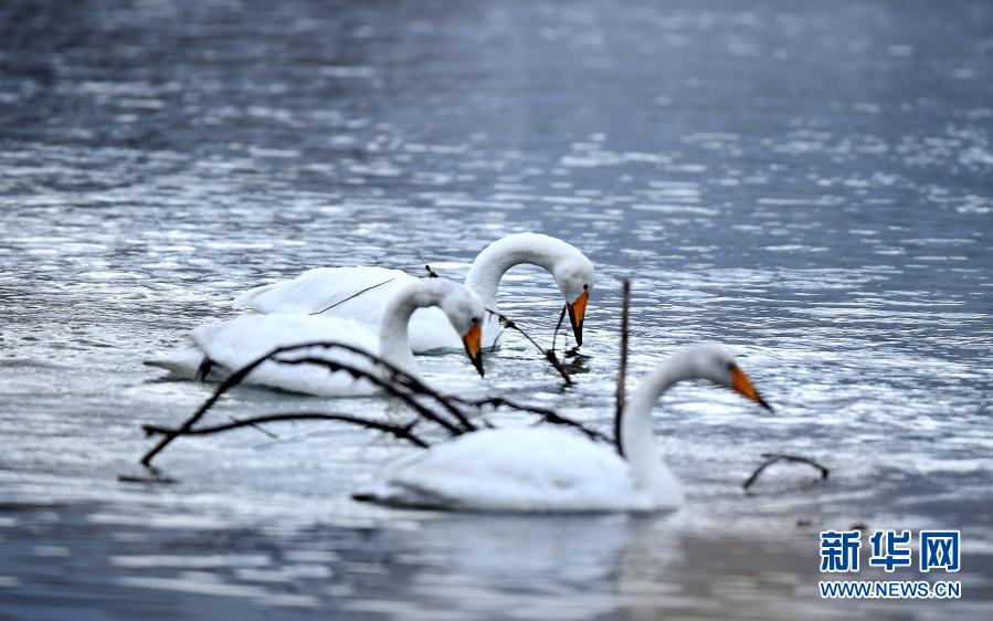 1月22日,大天鵝在青海省貴德縣境內(nèi)的黃河中覓食。新華社記者 張宏祥 攝