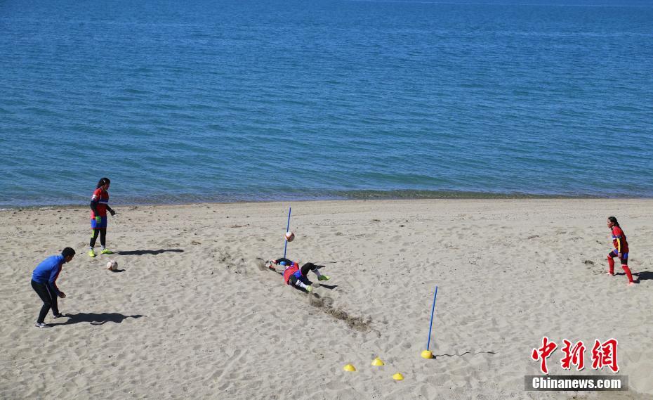 青海湖民族寄宿制學(xué)校女子足球隊(duì)的隊(duì)員們在青海湖畔沙灘上進(jìn)行訓(xùn)練。中新社記者 馬銘言 攝