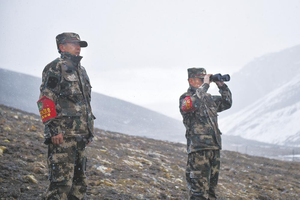 4月23日,祁連山國(guó)家公園沙龍灘管護(hù)站生態(tài)管護(hù)員羅藏次成(右)在巡護(hù)途中使用望遠(yuǎn)鏡監(jiān)測(cè)野生動(dòng)物。新華社 吳剛 攝