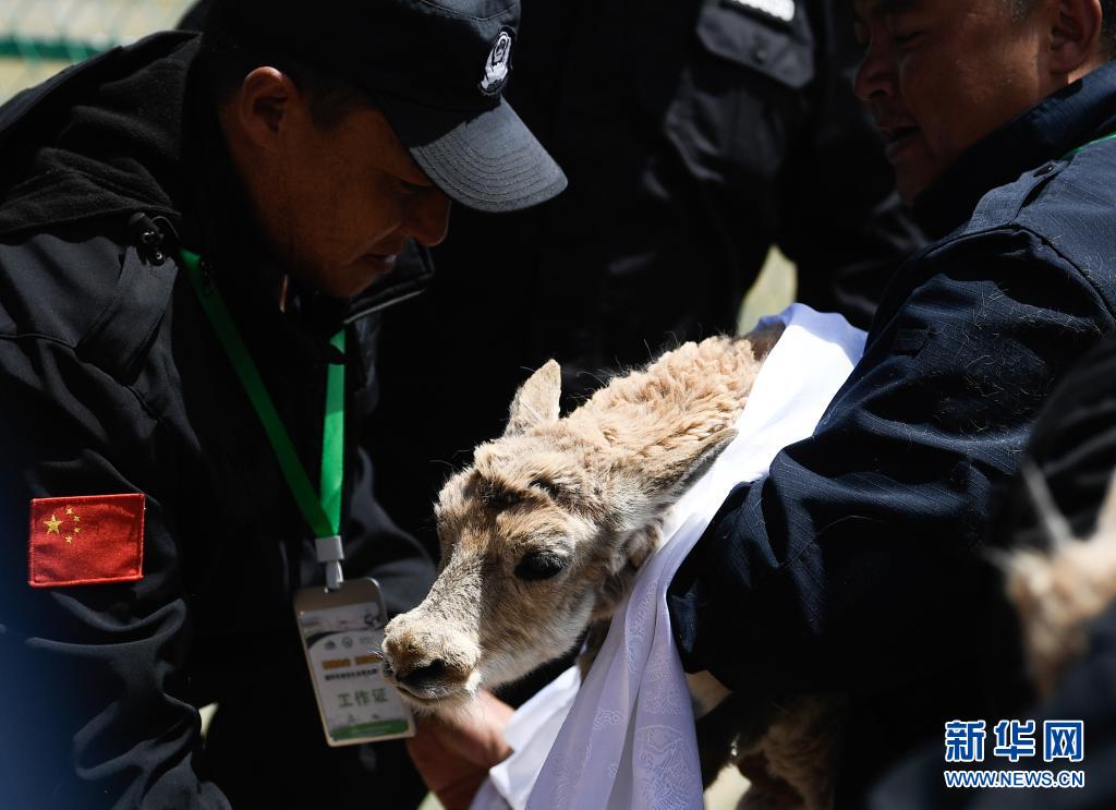 7月7日,在可可西里索南達杰保護站野生動物救助中心,可可西里巡山隊員按照風俗為放歸的藏羚羊戴上哈達表達祝福。新華社記者 張龍 攝