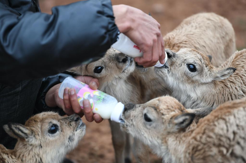 2020年7月7日,三江源國家公園管理局長江源園區(qū)可可西里管理處卓乃湖保護站的工作人員才文多杰在給藏羚羊幼仔喂奶。新華社記者薛玉斌 攝
