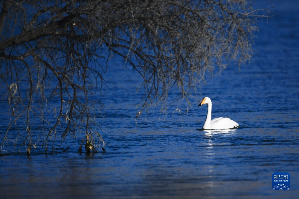 這是12月24日在青海省海南藏族自治州貴德縣境內(nèi)的黃河濕地拍攝的天鵝。新華社記者 張龍 攝