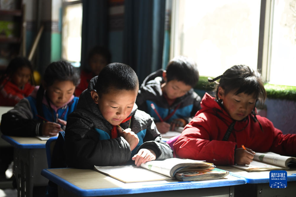 4月22日,青海省玉樹藏族自治州曲麻萊縣巴干鄉(xiāng)寄宿制小學的學生在課堂上學習。新華社記者 張龍 攝